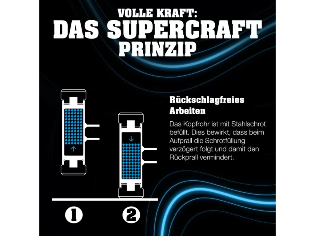 Hlava kladiva SUPERCRAFT je vyplnená oceľovými brokmi. To spôsobí, že plnenie abrazíva bude nasledovať s oneskorením, keď úderná plocha narazí na obrobok. Znížený odskok umožňuje optimálne využitie energie nárazu. To umožňuje veľmi silné údery. Okrem toho je práca s kladivami SUPERCRAFT oveľa bezpečnejšia, šetrnejšia ku kĺbom a tichšia ako s bežnými oceľovými kladivami.